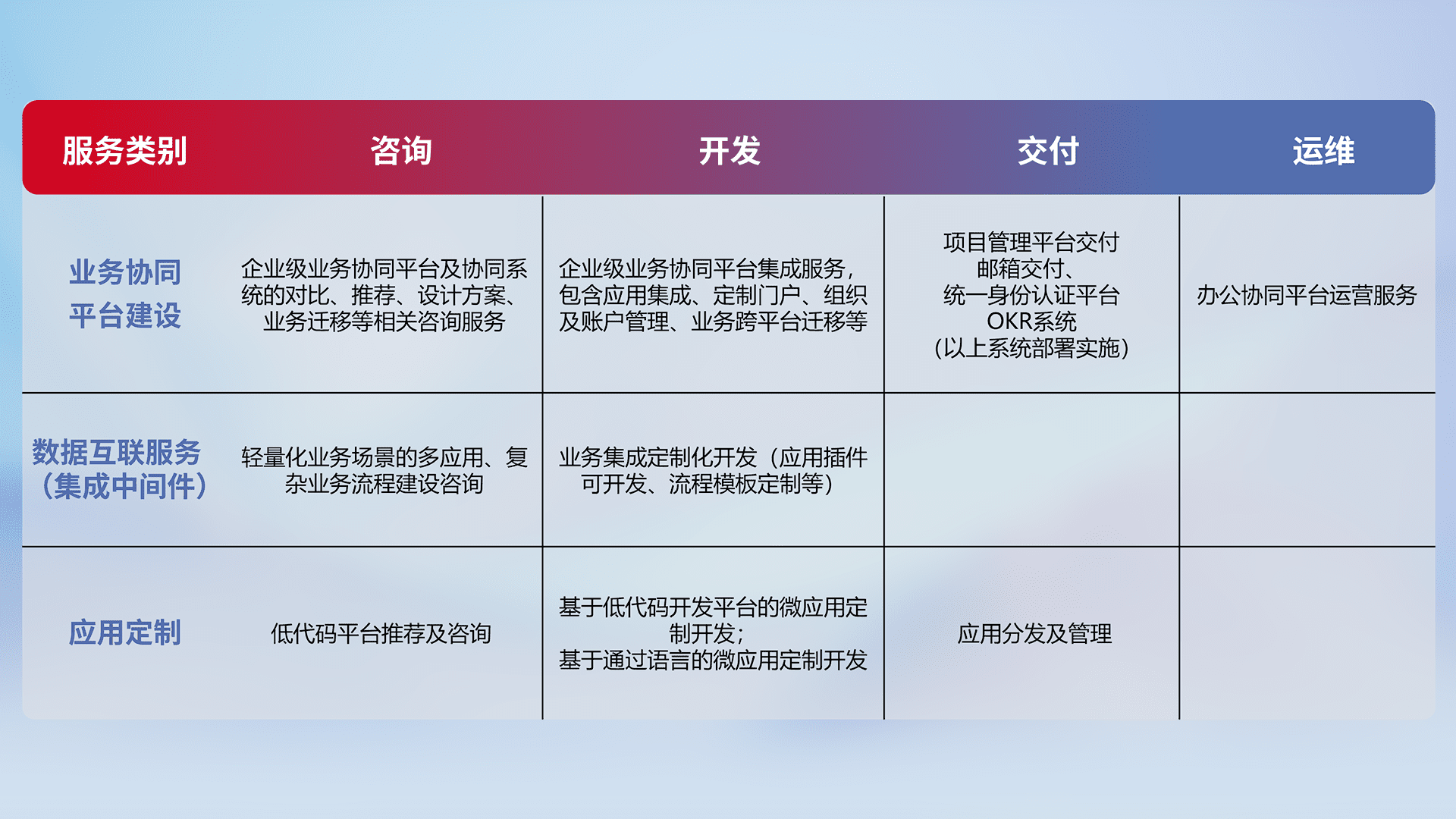 针对钉钉、、、企微、、IDaas等平台级产品提供产品的规划、、、方案、、、交付、、、定制化开发等服务,,,,实现如统一协同办公、、、智能客户服务、、、、混合会议管理、、、、智能数据查询、、、、等业务场景,,实现数字化转型。。。。