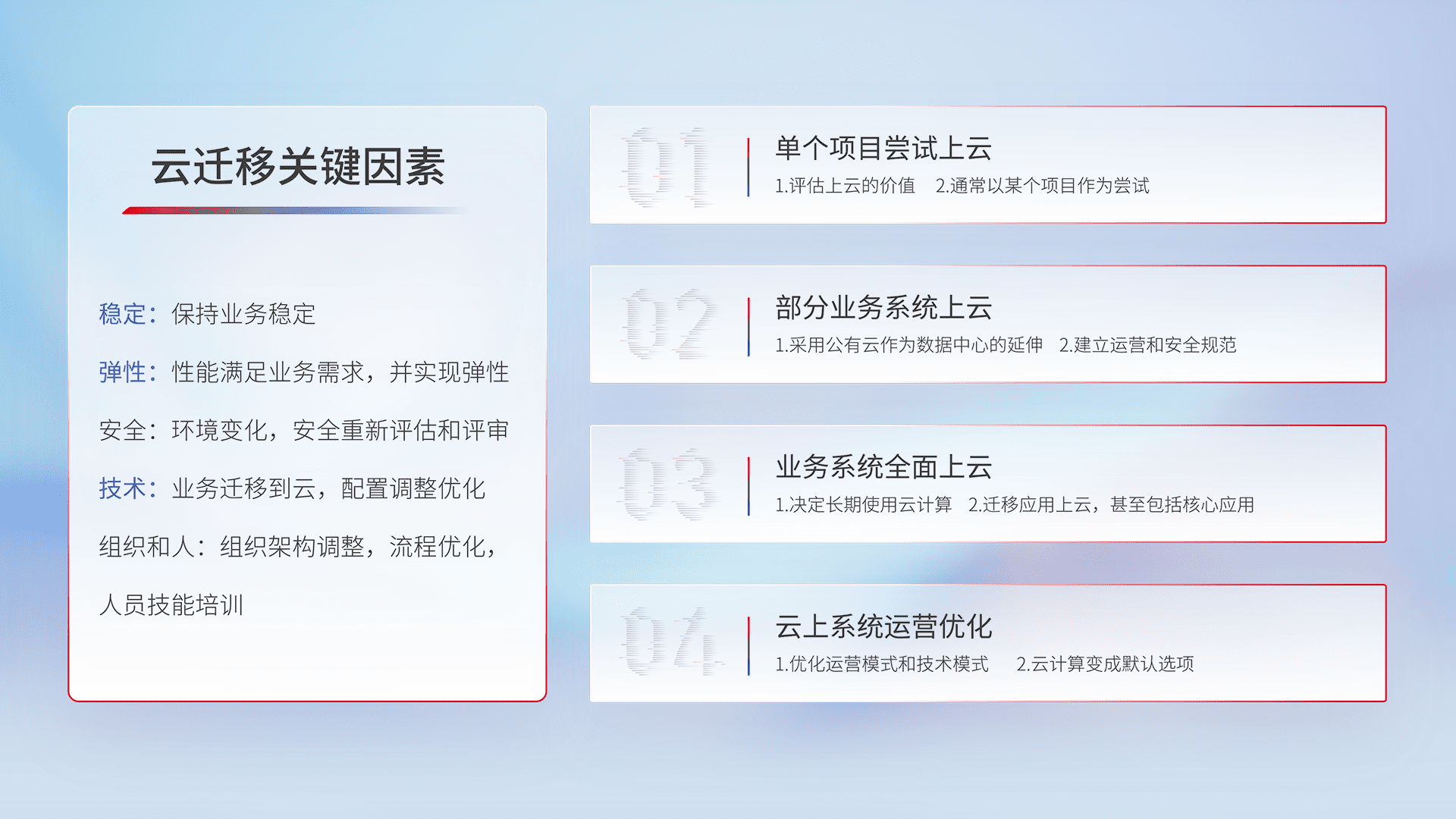 结合实际业务,,,从规划设计、、、云平台选型、、、云原生改造、、、、数据迁移、、集成交付,,迁移全过程为客户识别最佳上云路径,,,做好风险识别管理,,设计网络架构、、、身份权限、、、、安全审计合规、、、操作审计、、、日志审计、、、监控告警策略、、、、多站点容灾设计等,,,对云上基础设施进行整体规划,,,,提升IT治理水平,,,以满足弹性、、高可用、、、、高性能的需求。。