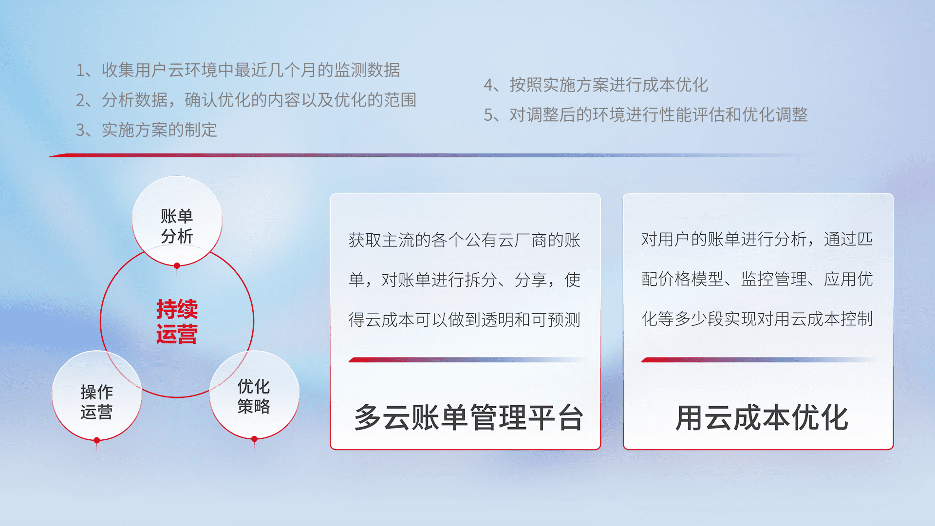 通过多云纳管,,,以统一的资源数据模型把客户的云资源进行抽象和封装,,,进而实现对多云资源的统一操作,,,保障云资源管理的可靠性、、、、稳定性与可用性。。量身定制化运维内容,,配置、、、开发运维、、补丁管理、、、备份、、监控、、、认证和访问管理、、审计和日常巡检等,,保障在用云过程中的可靠度,,,,稳定度以及高可用率。。
