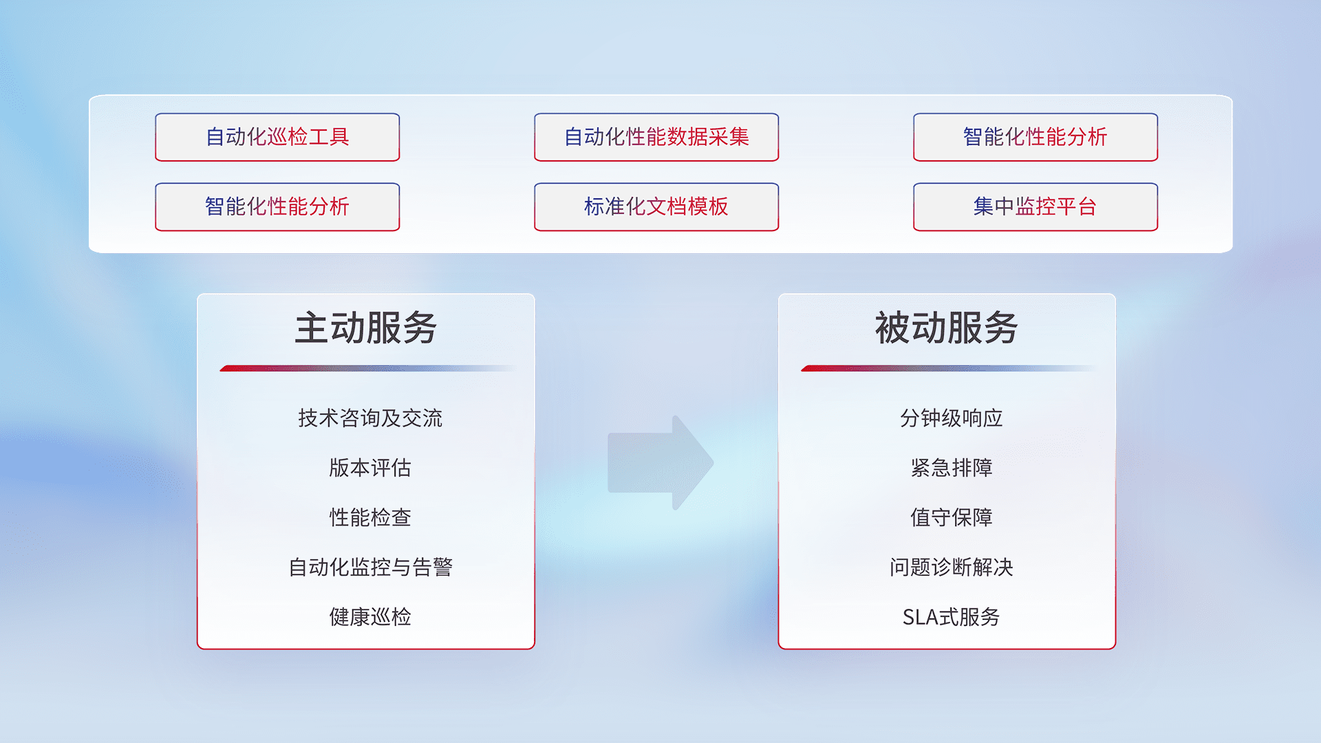 智能化工具和标准化文档,,,保障服务质量,,提供主动服务(包含技术咨询、、、版本评估、、、、性能检查、、、、自动化监控与告警、、、、健康巡检)和被动服务包含(分钟级响应、、、紧急排障、、、、值守保障、、、、问题诊断解决、、、SLA服务)。。。。